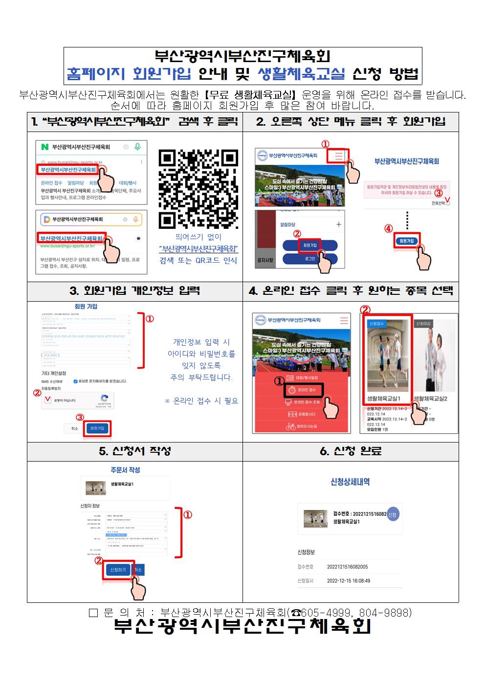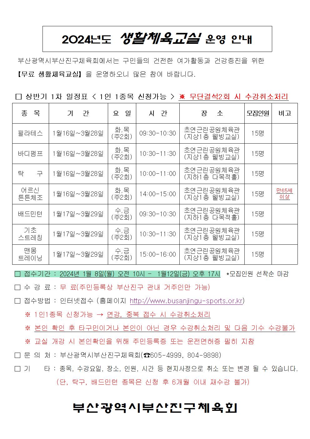 2024년도 상반기 1차 생활체육교실 신청접수 안내 페이지 정보 작성일 23-12-27 09:54 본문 2024년도 상반기 1차 생활체육교실 신청접수 안내 첨부파일 2024년도 상반기1차 안내문.hwp (1.7M) 20회 다운로드 | DATE : 2023-12-27 09:55:39 목록 이전글'골 때리는 그녀들' [2024년 부산진구 여성축구교실] 24.02.05 다음글2023년도 백양산 숲길 걷기대회 공지 23.10.25
