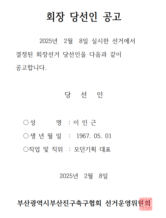 부산광역시부산진구축구협회 회장선거 당선인 공고 페이지 정보 작성일 25-02-11 16:33 본문 [이 게시물은 관리자님에 의해 2025-02-14 17:22:09 공지사항에서 이동 됨] 목록 답변 이전글부산광역시부산진구합기도협회 회장선거 당선인 공고 25.02.12 다음글부산광역시부산진구에어로킥협회 회장선거 당선인 공고 25.02.11