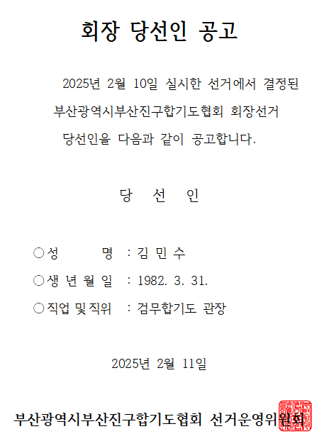 부산광역시부산진구합기도협회 회장선거 당선인 공고 페이지 정보 작성일 25-02-12 10:12 본문 [이 게시물은 관리자님에 의해 2025-02-14 17:22:09 공지사항에서 이동 됨] 목록 답변 이전글부산광역시부산진구족구협회 회장선거 당선인 공고 25.02.12 다음글부산광역시부산진구축구협회 회장선거 당선인 공고 25.02.11