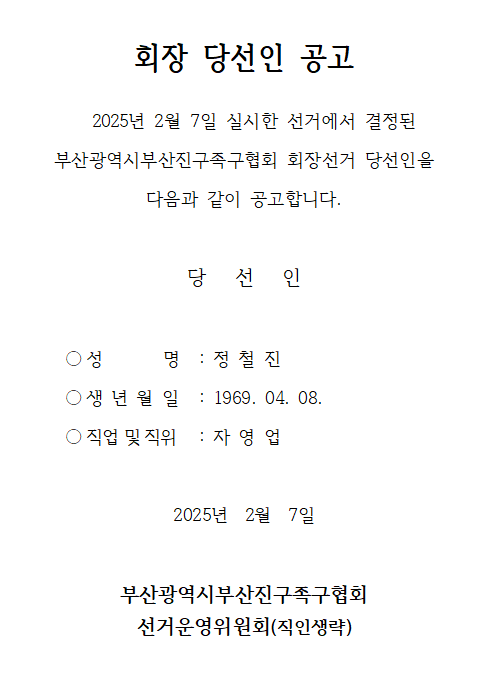 부산광역시부산진구족구협회 회장선거 당선인 공고 페이지 정보 작성일 25-02-12 17:35 본문 [이 게시물은 관리자님에 의해 2025-02-14 17:22:09 공지사항에서 이동 됨] 목록 답변 이전글부산광역시부산진구배구협회 회장선거 당선인 공고 25.02.12 다음글부산광역시부산진구합기도협회 회장선거 당선인 공고 25.02.12
