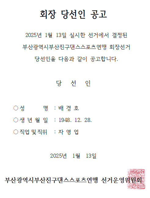 부산광역시부산진구댄스스포츠연맹 회장선거 당선인 공고 페이지 정보 작성일 25-01-15 17:58 본문 [이 게시물은 관리자님에 의해 2025-02-14 17:22:33 공지사항에서 이동 됨] 목록 답변 이전글부산광역시부산진구공수도연맹 회장선거 당선인 공고 25.02.14 다음글부산광역시부산진구줄넘기협회 회장선거 당선인 공고 25.01.15