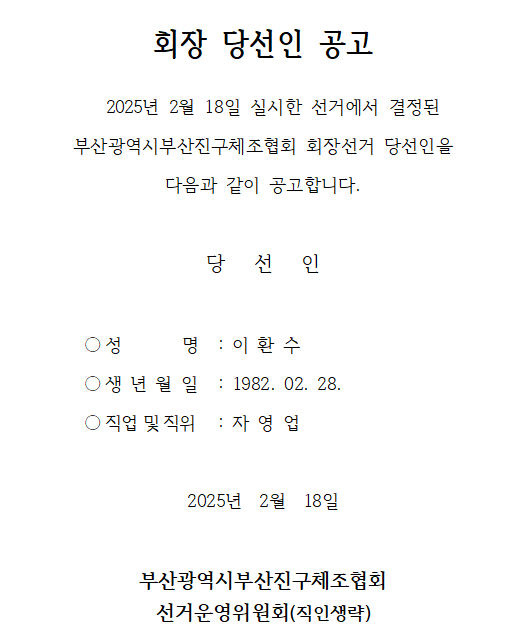 부산광역시부산진구체조협회 회장선거 당선인 공고 페이지 정보 작성일 25-02-19 14:35 본문 목록 답변 이전글부산광역시부산진구태권도협회 회장선거 당선인 공고 24.12.20 다음글부산광역시부산진구공수도연맹 회장선거 당선인 공고 25.02.14