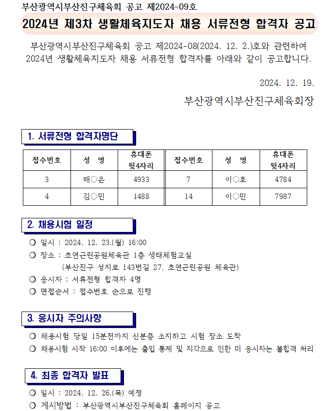 2024년 제3차 생활체육지도자 채용 서류전형 합격자 공고 페이지 정보 작성일 24-12-19 16:55 본문 목록 답변 이전글2024년 제3차 생활체육지도자 채용 최종 합격자 공고 24.12.26 다음글2024년 제3차 생활체육지도자 채용 계획 공고 24.12.02